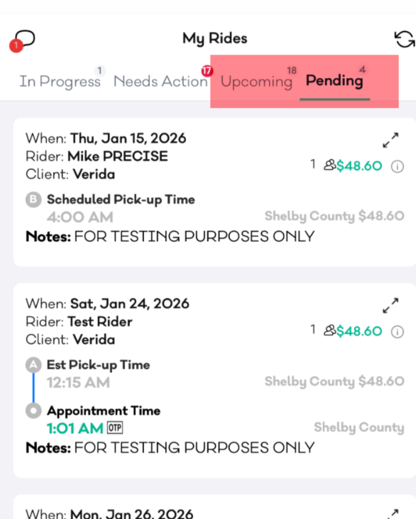 A new Pending tab in My Rides to track offers under review