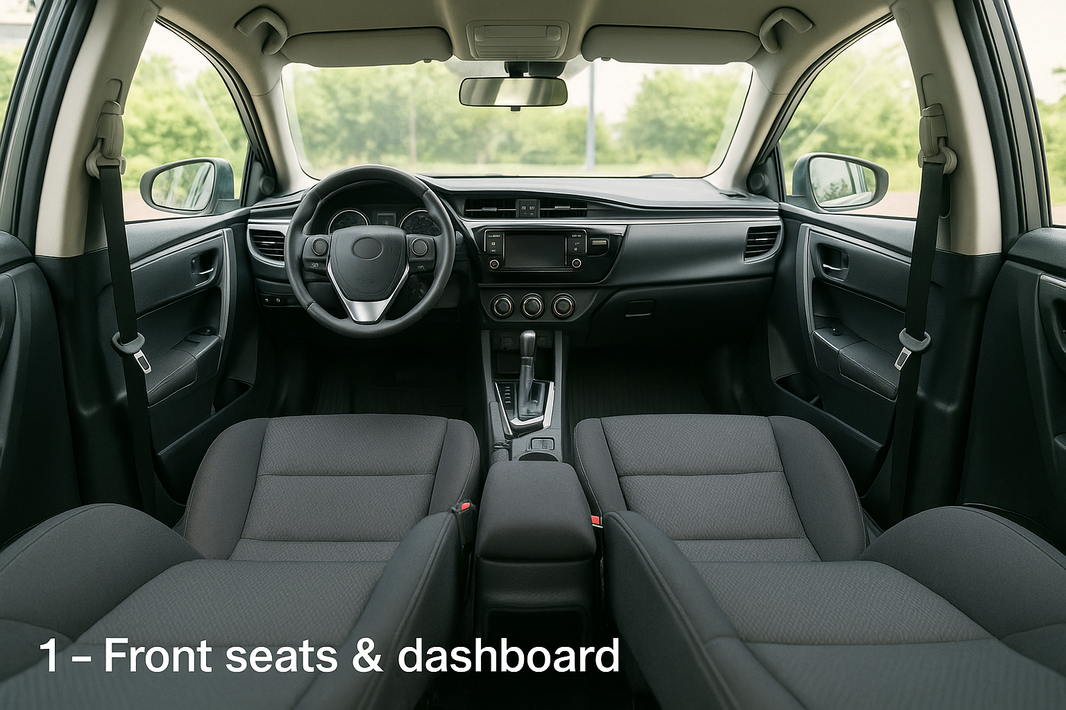 1. Front seats and dashboard. Driver and passenger seats in one wide shot, including floor mats. |