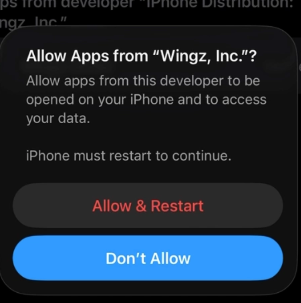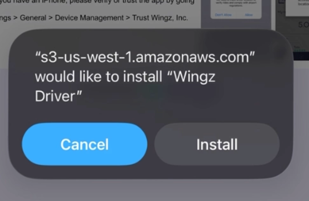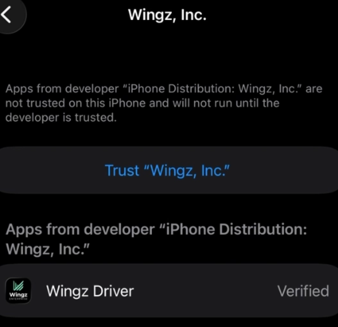 | You will get an error message “Untrusted Enterprise Developer” the first time you open the app. The Wingz Driver App is distributed directly to contracted drivers and isn’t publicly listed in the App Store. Apple requires a one-time manual trust step for enterprise apps. This is normal and safe. After you trust it once, you won’t need to do it again. |